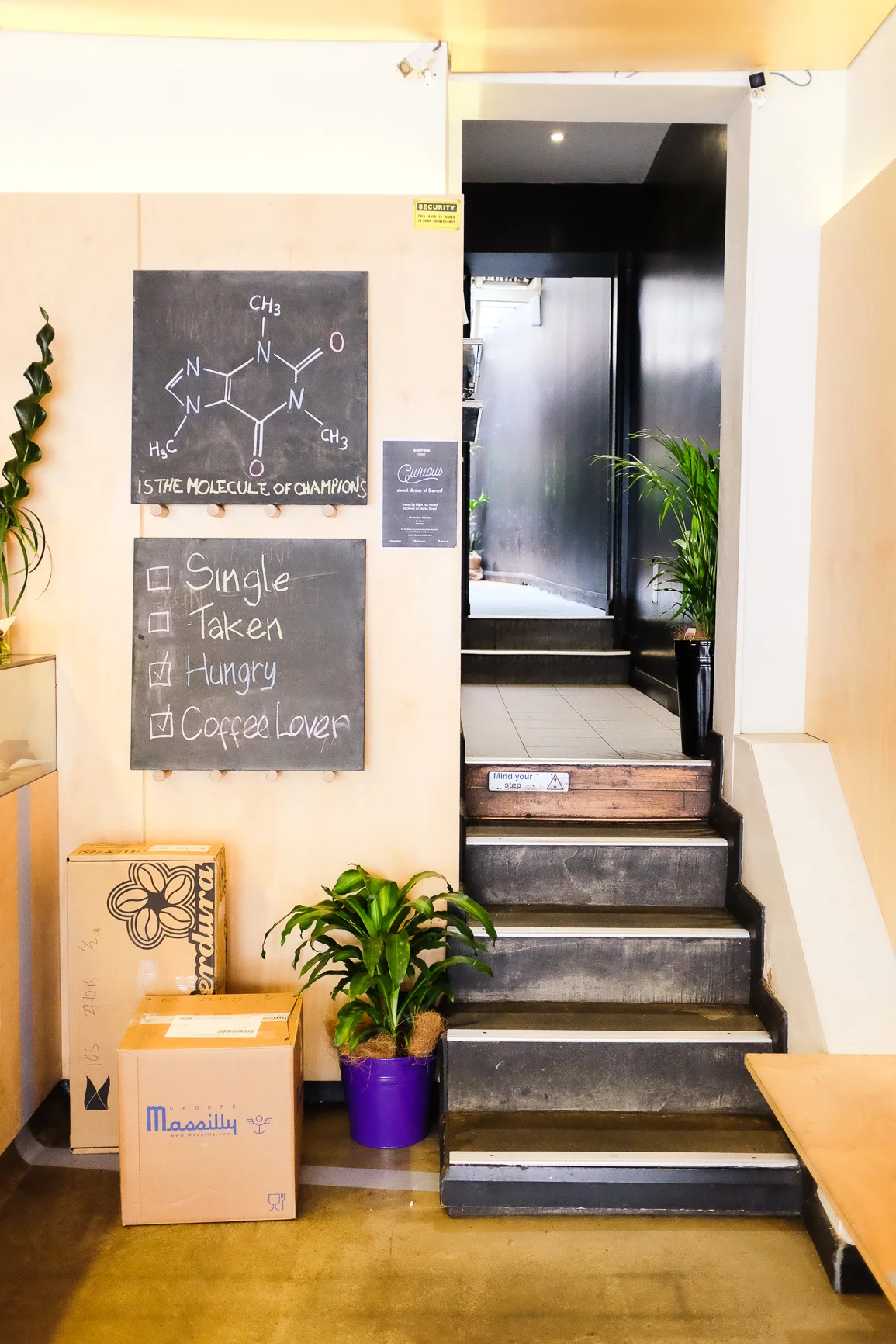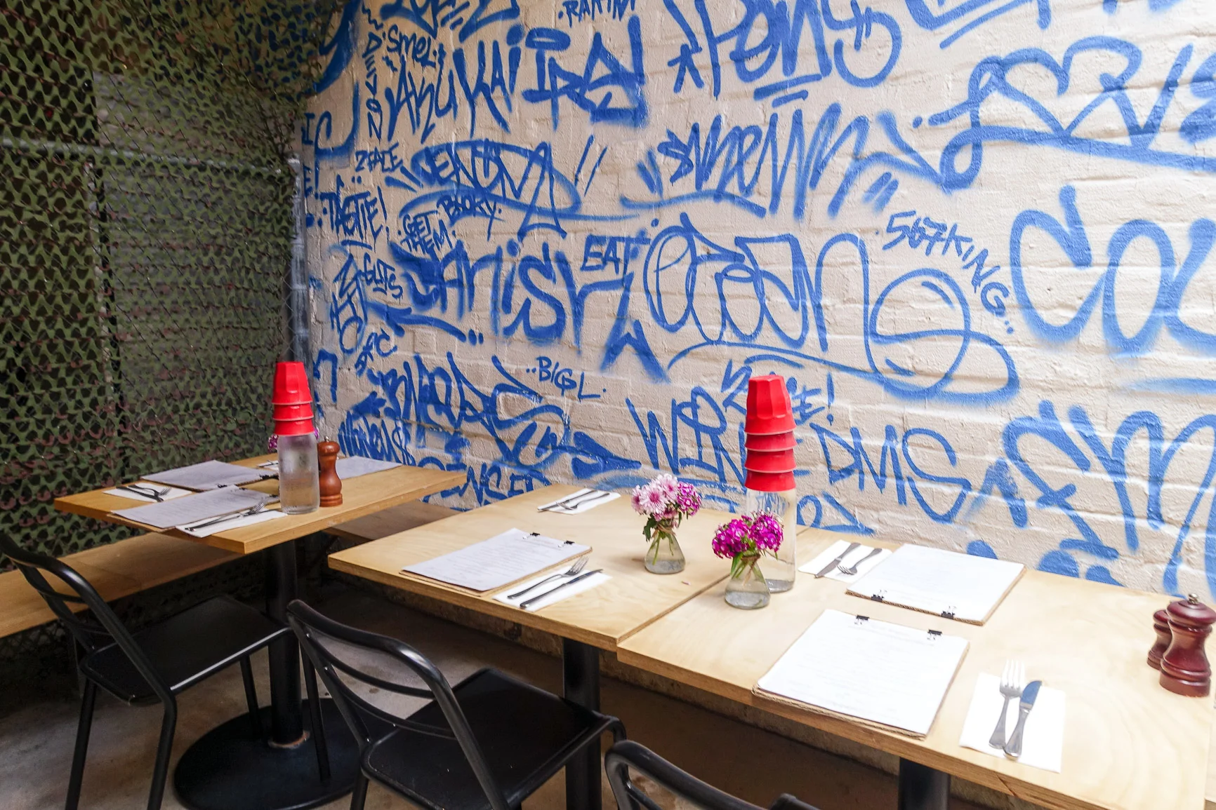 The cafe staff were joking loudly to themselves, singing the choruses of pop songs (Bang Bang no less) with no problems but faltering and muttering when it came to the verses. Obvious slip ups of lyrics were followed by laughter. A guy with cool hair and a warm smile greeted me and showed me to the private courtyard of the cafe, where a few groups had gathered over coffee and breakfast backed by a graffitied wall and utilitarian style camouflage netting.