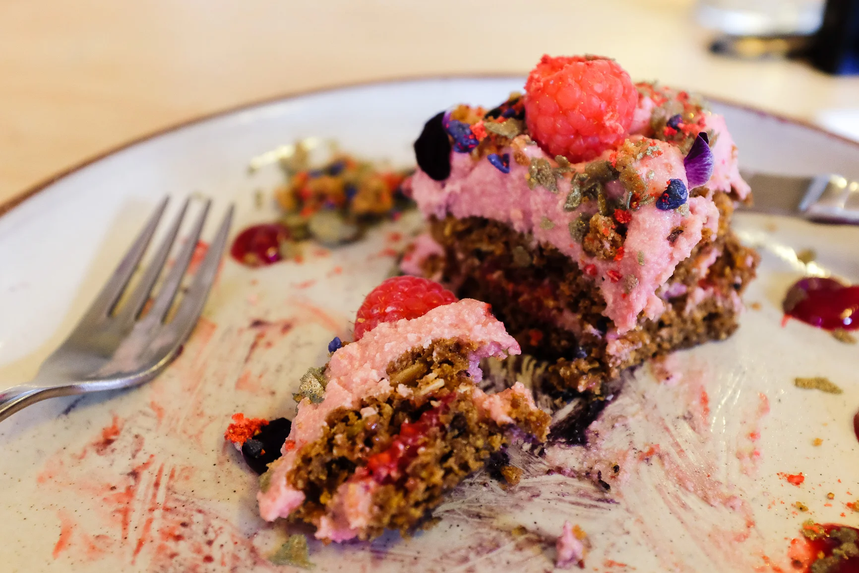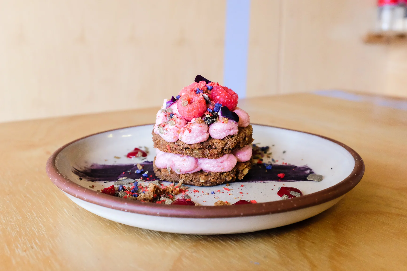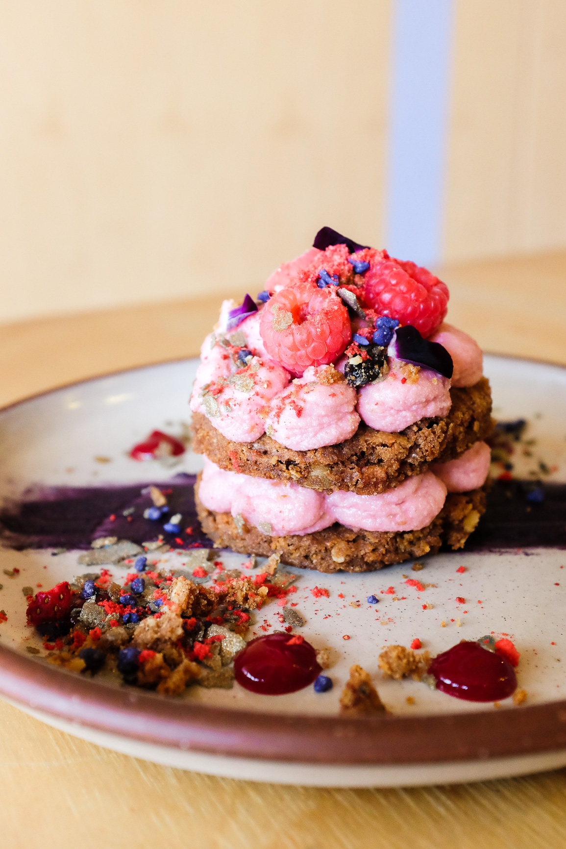 A stack of purples, browns and pinks on a plate made its way from the kitchen to the empty space in front of me. It took a little while for me wrap my mind around the layered perfection and for a split second I wasn't sure if it was what I had ordered. Calvin walked past, signalled me with an A-ok sign and gloated at my reaction. I was then left to enjoy/pluck up the courage to break this cinnamon muesli based cookie with my fork.