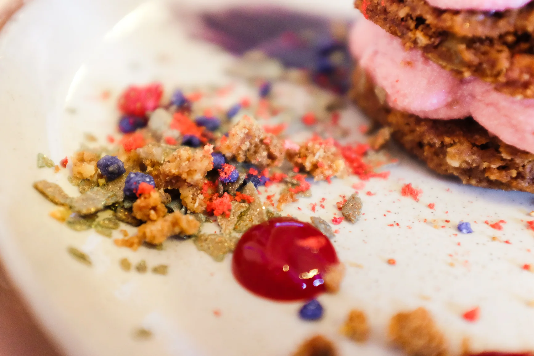 Buttery feuilletine was crumbled into two chaotic piles on either side of the centrepiece, mixed in with purple, pink and gold sparkles for good measure. The fresh raspberries sat atop the dish in glory and were the last to go. This quirky and colourful rendition of Cookies 'N Cream was so far removed from the typical associations of chocolate and vanilla. It further foregrounded the food on offer as unique and modern twists on the classic dish.