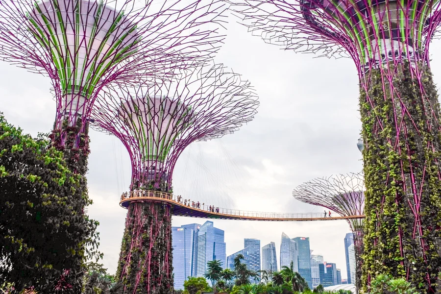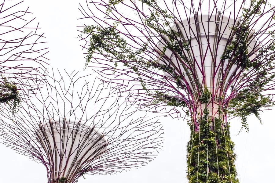 There are 18 Supertrees in total, scattered around Bay South at Gardens by the Bay. Reaching some 42 metres in height, a 128 metre long suspended walkway connects two trees, enabling visitors to take in the view of the surrounds at 22 metres high. The city scape views are particularly beautiful, as is that of the sheer architectural brilliance of Marina Bay Sands.