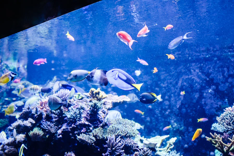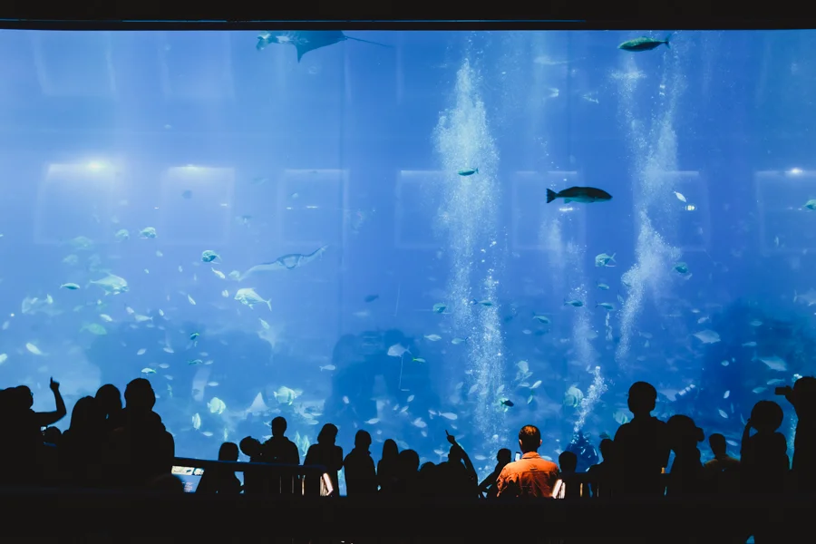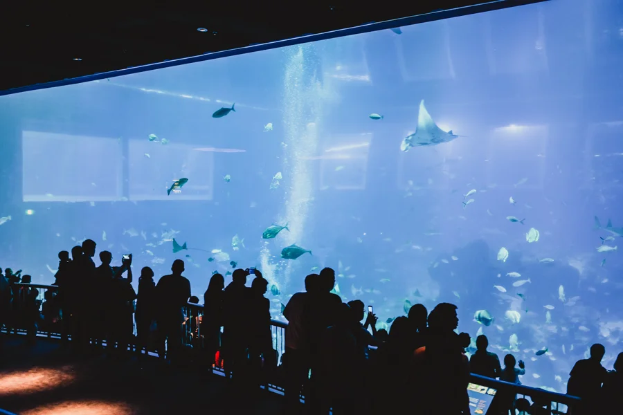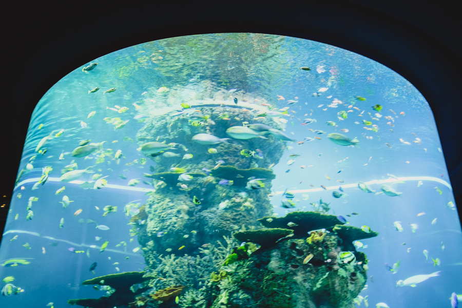 Among the many different habitats are some 800 species, divided by geography and compatible species type. Its 10 zones provide interesting showcases, with an underwater tunnel Shark Sea and an open ocean panoramic encounter. The Ocean Dome offers panoramic 80 degree views of this Open Ocean habitat with many fish swirling around like confetti in snow globes. The Discovery Zone is home to a floor aquarium and a creature petting pool for kids (and curious adults) to touch the starfish and assortment of sea creatures.