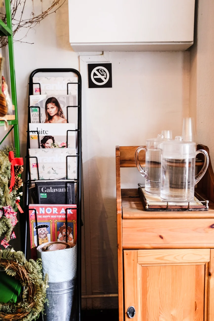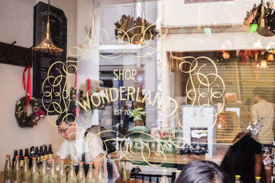 It was to my delight that I stumbled across this cute cafe, retail store and workshop studio. Combining three things I love most, Shop Wonderland's golden accents made it an eye catching shop front, pulling me in, with the interior making me stay. At the time, the cafe was adorned with Christmas decorations, stockings and wreaths among the usual draped colourful lights.